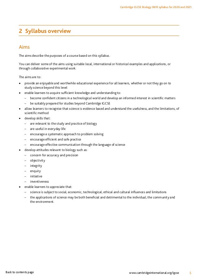 Any textbooks endorsed to support the syllabus for examination from 2016 are. Cambridge IGCSE Biology 0610 syllabus for 2020 and 2021. Changes to this syllabus for 2020 and 2021 58 Changes to this syllabus For information about changes to this syllabus for 2020 and 2021 go to page 58.